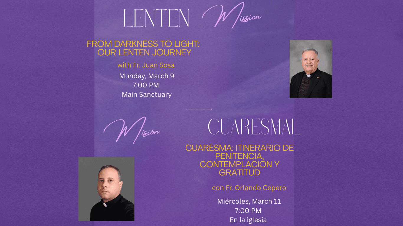 From Darkness to Light: Our Lenten Journey Monday, March 9th at 7:00 pm Main Sanctuary Cuaresma: Itinerario de Penitencia, Contemplación y Gratitud Miércoles, marzo 11 a las 7:00 pm En…